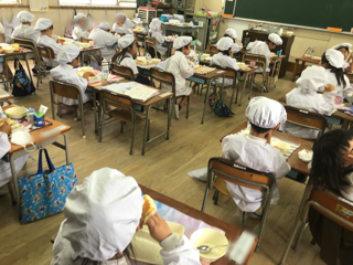 配膳が終わり、1学期最後の給食を食べます。机は前を向いたままです。いただきますをして食べますが、友だちとの会話はできないままです。
