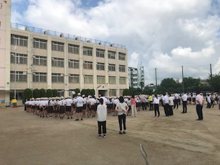 1学期の終業式は運動場で行いました。