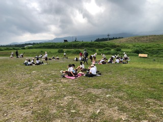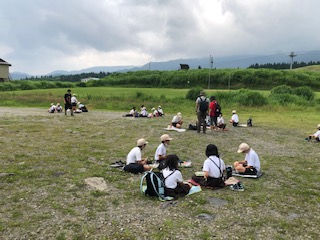 宿舎前の広場で昼食のお弁当を食べます。班ごとに集まって食べます。