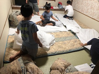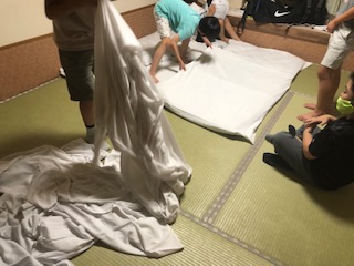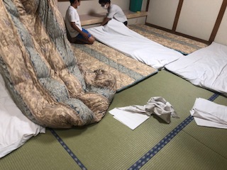 部屋に布団を敷いていきます。かなり苦労していました。(写真はすべて男子の部屋です)