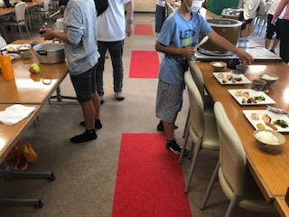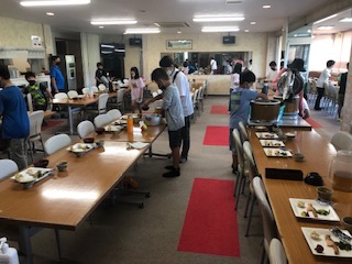 食事係の子どもたちが朝食の準備をしています。ありがとう。