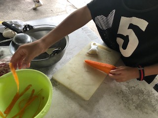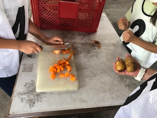 野菜を切ります。にんじん、じゃがいも、玉ねぎです。