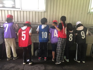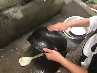 楽しいカレー作り、みんなで仲良く食べた後は鍋や飯ごう、お皿などをしっかりと洗います。教員やスタッフの方から合格が出るまでがんばって洗いました。