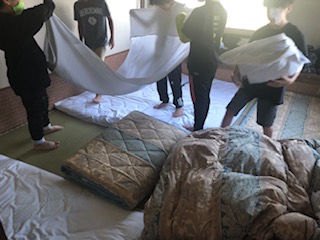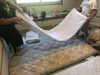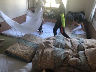 協力しながら布団やシーツを片付けていきます。(部屋の写真はすべて男子の部屋です)