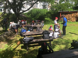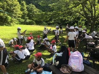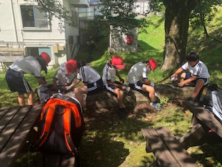 木陰で焼いた板を磨きます。表面に炭がついているのを取ってきれいにしていきます。