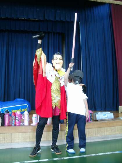 3枚目は、猛獣狩りのゲームの進行をしていた西淀川特別支援学校のヒーローと、大和田小学校のベーダー卿です。