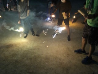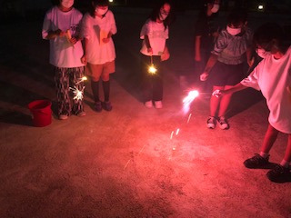 運動場で花火をしました。