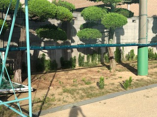 芝生横の高いブロック塀(上の写真の赤色の線)を低くしたり、安全面の向上を図ったりしていきます。