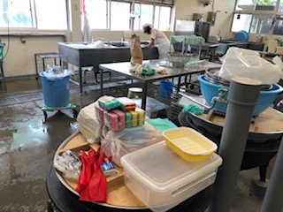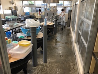 来週には二学期が始まり、給食も開始されます。給食調理員さんが給食室の清掃を行っていました。