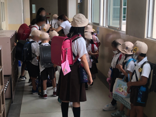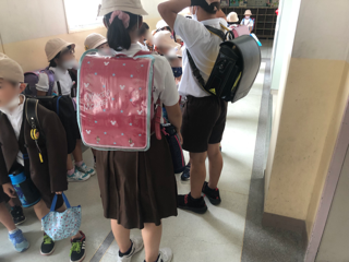 今日は台風の接近を想定しての避難訓練をしました。まず、6年生、5年生が1年生を教室まで迎えにいきます。