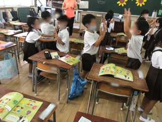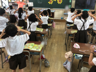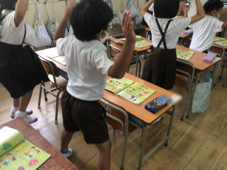 1年生は音楽に合わせて踊っています。ペアでも楽しんでいますね。