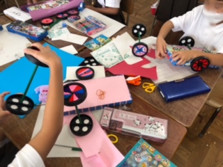 動く車を作っています。今日は車輪のデザインを考えながら作っていきました。