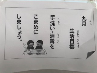 今日から9月となりました。9月の生活目標は「手洗い・消毒をこまめにしましょう。」です。