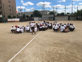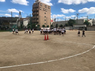 運動場で遊んでいた子どもたちが校舎から離れた運動場の真ん中に集まって、座って地震の揺れ(想定)に備える訓練をしました。