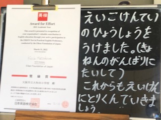 昨年度の英語検定への取り組みに対しての表彰がありました。今日の児童朝会で子どもたちにも紹介します。