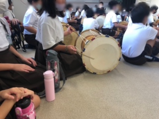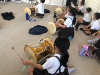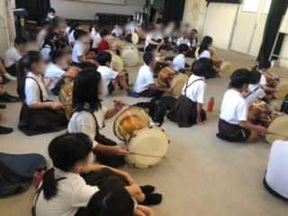 今日は4年生の学年全体でチャンゴ(韓国・朝鮮の民族楽器)の練習をしました。