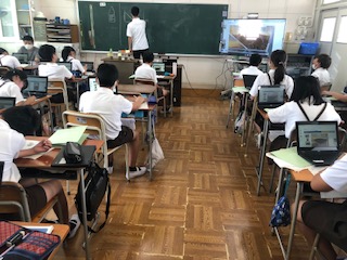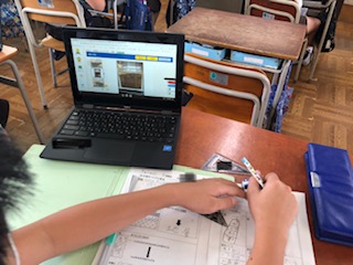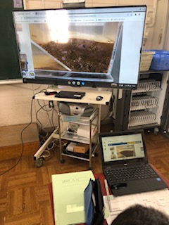 6年生は地学分野の地層について学習しています。地層を見ることができればよいのですが実際にはむずかしいので、端末で資料を調べています。