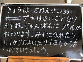 今日は5年生のプール水泳が最終となります。これから順にプール水泳の指導が終わっていきます。(2年生は金曜日が最終となります)