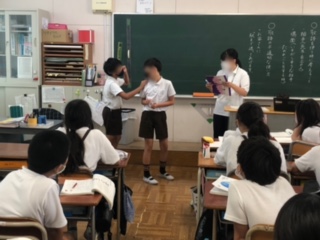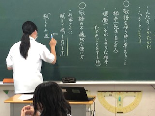 教育実習は主に6年生の教室で実習を続けています。担任や校長の指導のもと、実習授業をしました。上の写真は、敬語の言い方を寸劇として子どもたちが演じている場面です。