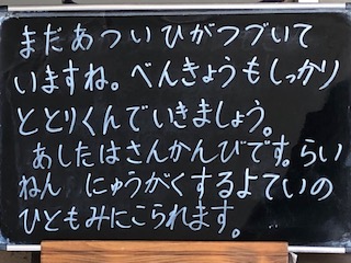 明日は学習参観です。また、来年度に小学校に入学する子どもたちの保護者の方々も来られます。