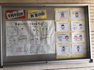 9月9日・救急の日にちなんだものや朝ごはんの大切さを伝えるものが貼られています。