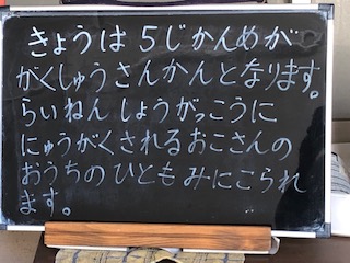 この学習参観の時に、来年4月に小学校ににされる児童の保健者の方への学校公開をします。その後、学校説明会を行います。