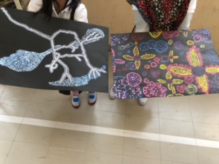 子どもたちはいい作品ができたと喜んでいます。並んで作品を見せてくれました。