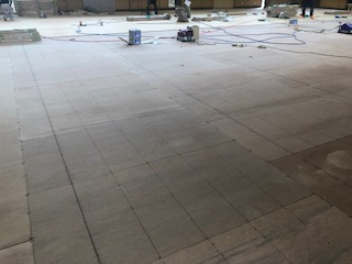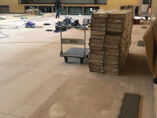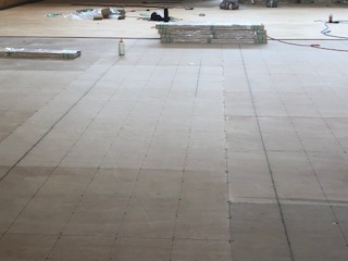 17日(土)の講堂の工事の様子です。床下の骨組みの上に板が張り詰めらているところです。工事監督さんのお話では、工事は順調に進んでいるとのことでした。
