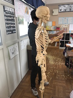 理科室にある人体の骨格標本も使いながらヒトの体について学習しています。