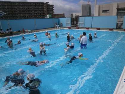 9日(木)突然さし始めた日光の中、6年生の着衣水泳を行いました。昨年も学習しましたが、今年も着衣のままの泳ぎにくさや不慮の事故に遭遇した時の対処の方法などをしっかり学ぶことができました。ペットボトル1本で浮いていられることや、履物は捨ててしまったほうが泳ぎやすくなることなど、実際に体験しなければわからないことがいっぱいでした。