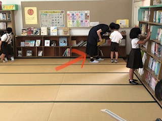 学校司書の方が週に一回、大和田小学校の図書館におられます。(写真での赤い矢印)