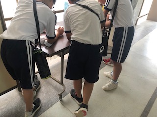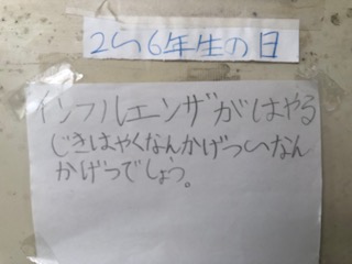 体育を終えた後、子どもたちが保健室前にいました。見ると、健康に関するクイズの答えを考えていました。