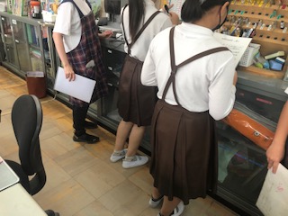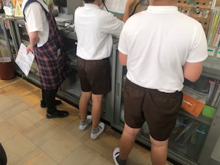 給食委員会の子どもたちが今日の献立について放送しています。栄養教員が横について指導しています。
