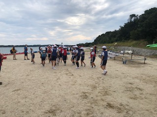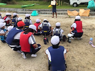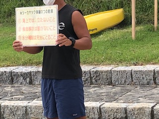 ライフジャケットをつけて、スタッフの方から注意事項をしっかりと聞いています。
