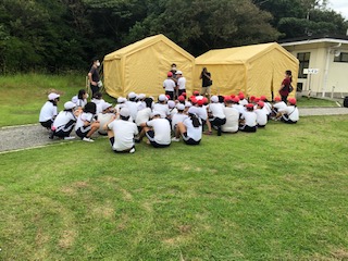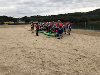砂浜で記念写真を撮って、スタッフの方にあいさつをしました。楽しい体験をていねいに教えていただき、ありがとうございました。