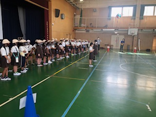 上の写真 お互いに向き合ってあいさつをしました。写真の右側に支援学校の子どもたちが並んでいます。