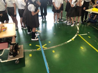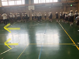 黄色い矢印のところに支援学校の子どもたちがいます。その前に通ってお別れのあいさつをしていきます。