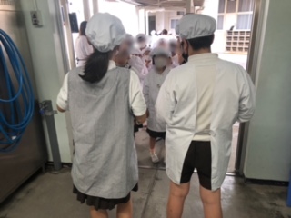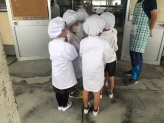 給食委員会の児童が並んでいる給食当番の子どもたちに声をかけています。
