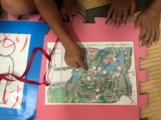 全校遠足は服部緑地でオリエンテーションをします。地図やまわるポイントなどを班で確認しています。