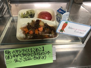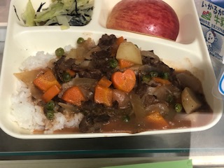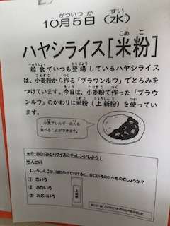 今日の給食はハヤシライスです。この献立のルーには小麦粉ではなく、米粉が使われています。