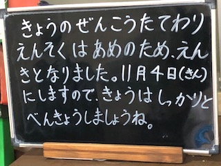今日の全校たてわり遠足は雨のため延期となりました。11月4日(金)に行います。今日は気持ちを切り替えてしっかりと学習しましょう。