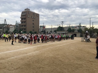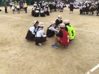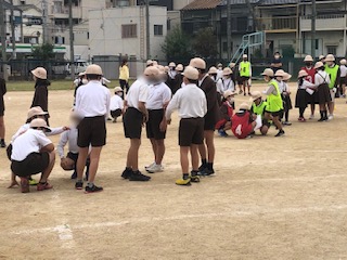 今日のなかよし集会は、「学校へ行こう」というゲームです。学校に関するもの、たとえば、「なふだ」と言われたら3文字なので3人が集まります。