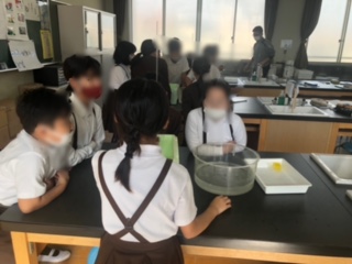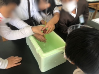 フラスコに水を入れて湯で温めます。ガラス管の中のゼリーが上に上がっていくのを観察しています。