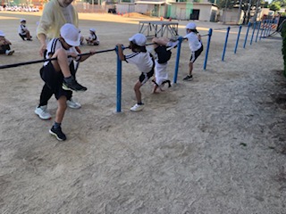 鉄棒に取り組んでいます。担任が手を添え、励ましながら指導しています。