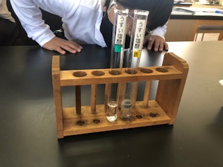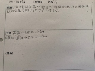 薄い塩酸に金属(鉄、アルミニウム)を溶かした時の変化を実験で確かめました。カードを使って学習を進めています。安全眼鏡(ゴーグル)で目を保護しながら実験しました。
