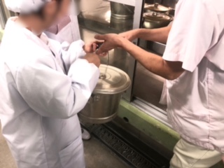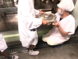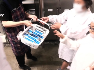 給食室では、給食調理員さんや栄養教員がおかずの食缶や牛乳などを給食当番の子どもたちに手渡しています。