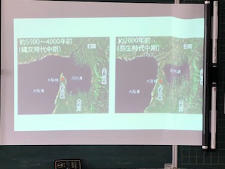 大阪の縄文時代と弥生時代の図を映しています。子どもたちの手元にもその写真入りのプリントが配られています。