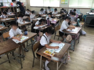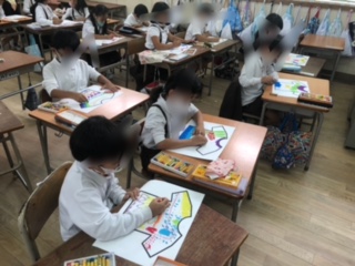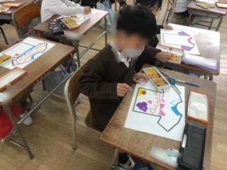 無地のTシャツに自分でデザインを考えて色を塗っていきます。