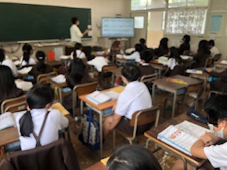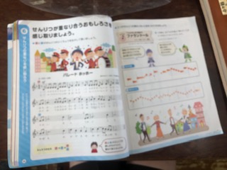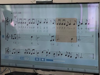 電子黒板には楽譜が表示されていて、歌の進行に合わせて色付きで進んでいきます。