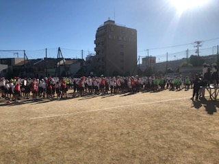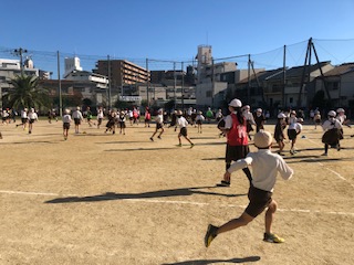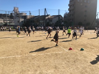 今日の児童集会は全校でのおにごっこ遊びです。6年生がおにの役となってスタートしました。